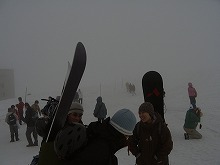 11:00AM 室堂到着。 ガスがすごくて視界は50m・・・ 腹ごしらえをした後、ひとまず登ってみようということに。 支度をして出発! 後ろまっしろでしょ。 |