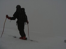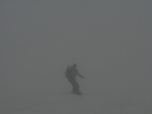 ガスと風で、無理をせず行ける所まで・・・ということで浄土山方面へ登り始める。本当に前が見えない、景色ももちろん見えない。 今日はまったりするつもりだったので、30分足らずのハイクで息切れ。 関東組室堂到着との連絡が入り、登れたところからドロップ。 堅いと思いきや、なかなかに滑りやすい雪でした。 一気に室堂へ滑り帰る。 |
