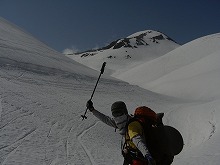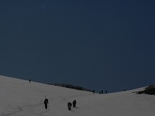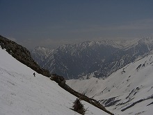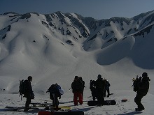 雄山の雪の付き具合が良くないということで、急遽ルートを変更し、 へ。 写真中央あたりからドロップ。 私は無線機片手に下で待機。爆睡。 みんなのドロップする姿は超かっこ良いい! この距離からでもザラメスプレー?があがっているのが見える。 無線機から、ドロップの報告が聞こえてくるたびに、目をこらす。 大きなターン、あるいは一気に・・・思い思いのシュプールを、自分だけのラインを雪肌に刻んでゆく・・・ 後で聞いたら、下のほうはやや難しい斜面だったようで、コケ者続出。でもみんな満足そうな顔。 |