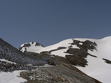 トラバースには夏山ルートを使った。 雪がだいぶ落ちていて、岩が顔を出している。 ボードブーツではおっかなびっくりという感じ。一歩一歩確実に。 太陽がサンサンと照りつける昼前。 汗だく。でも気持ちいい。 東一之越にてお昼ご飯。 これから滑るタンボ平を目の前に・・・ |
